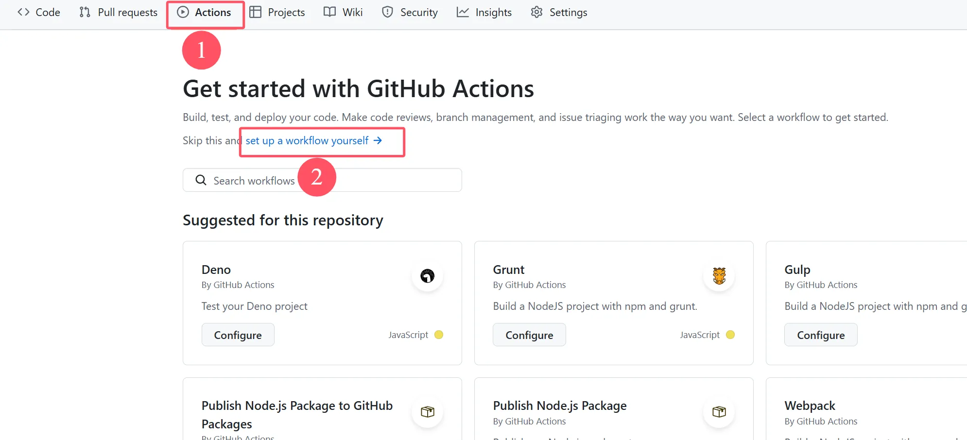 首先打开Actions页面 新建workflow(第一种方法 )