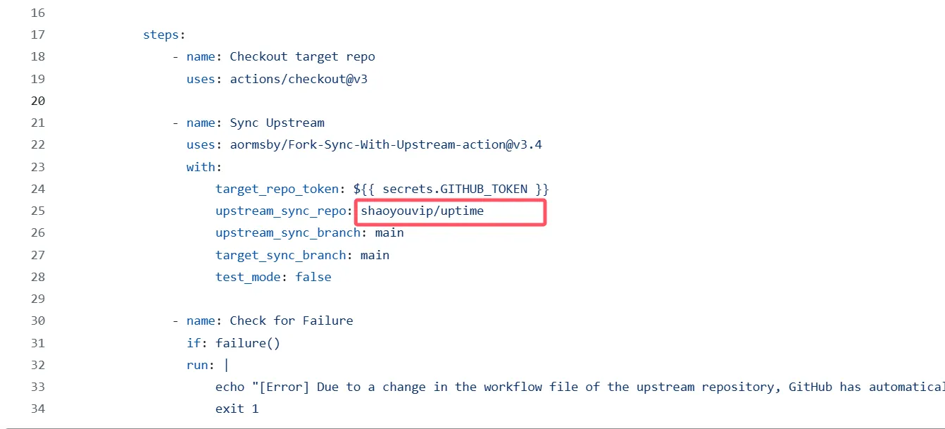 • 修改 upstream_sync_branchtarget_sync_branch 项,填写你要同步分支的名称,例如我填的main,一般来说fork的分支名称都一样,但这只是一般情况,也有的老项目默认的分支不是main,在 Sync Upstream 步骤中请一定确保你上游项目的分支路径。