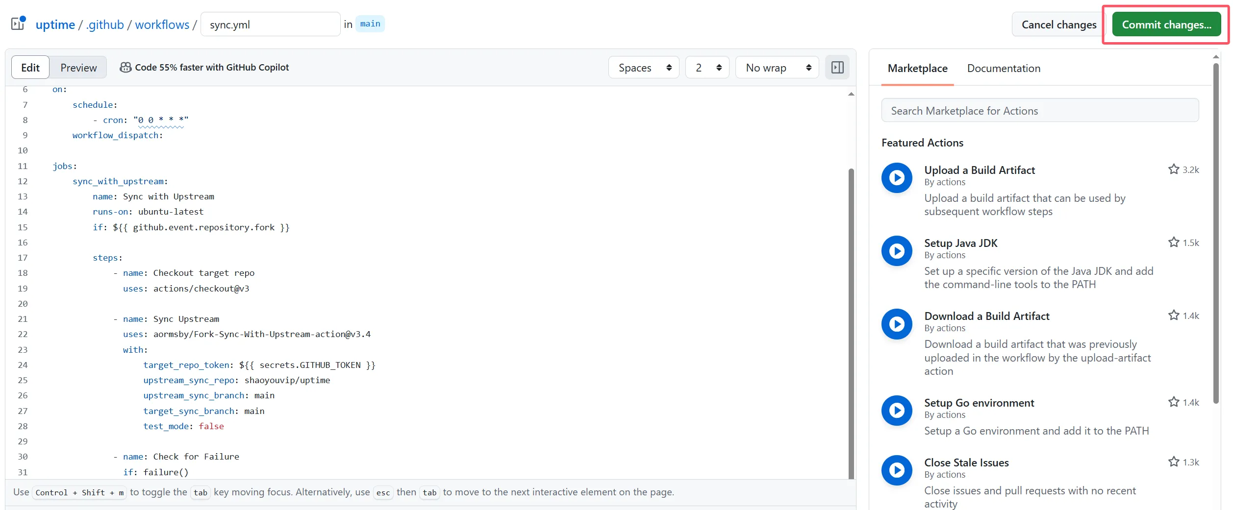 • 填写完成后点右上角 commit changes ,然后确认。